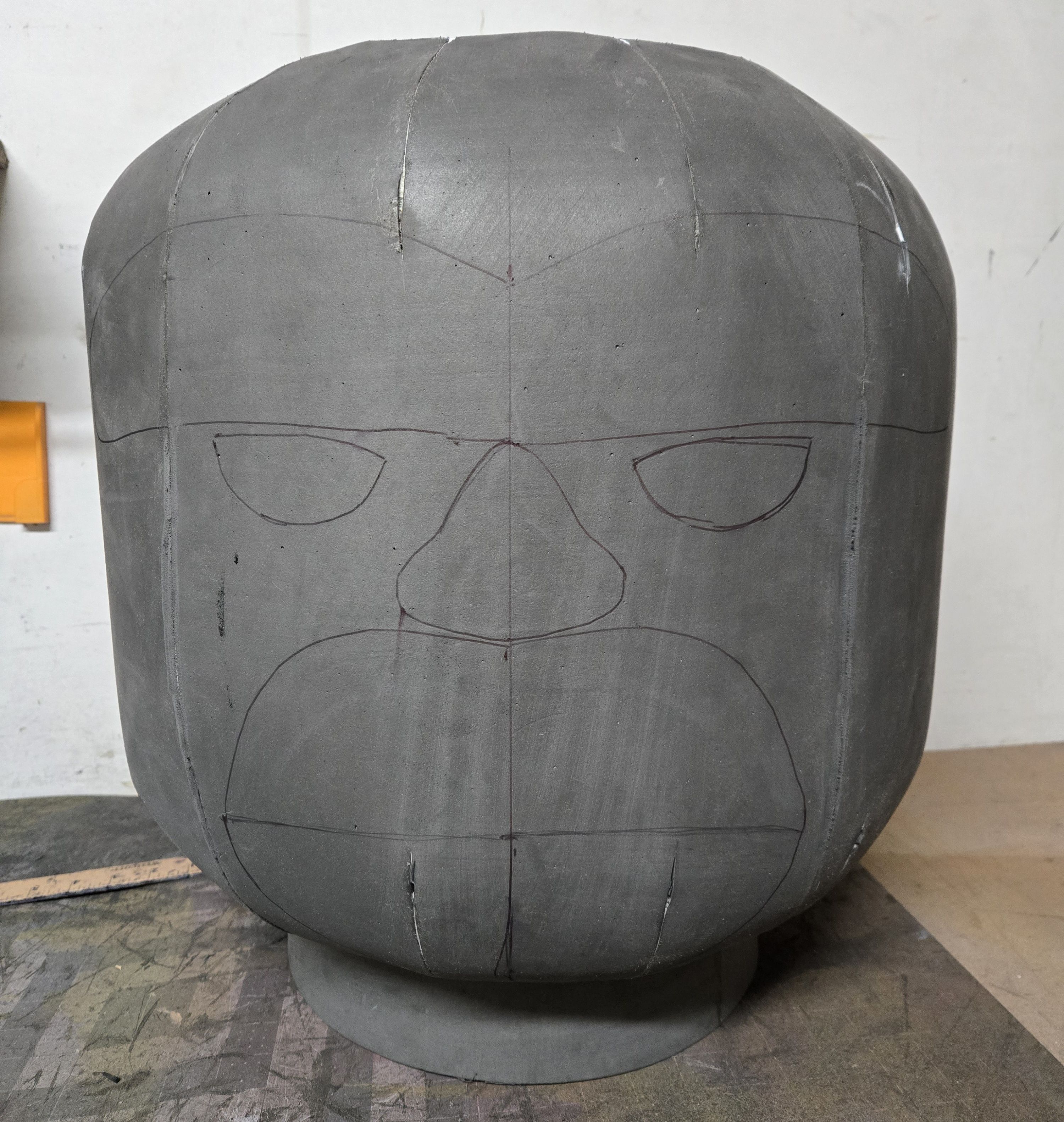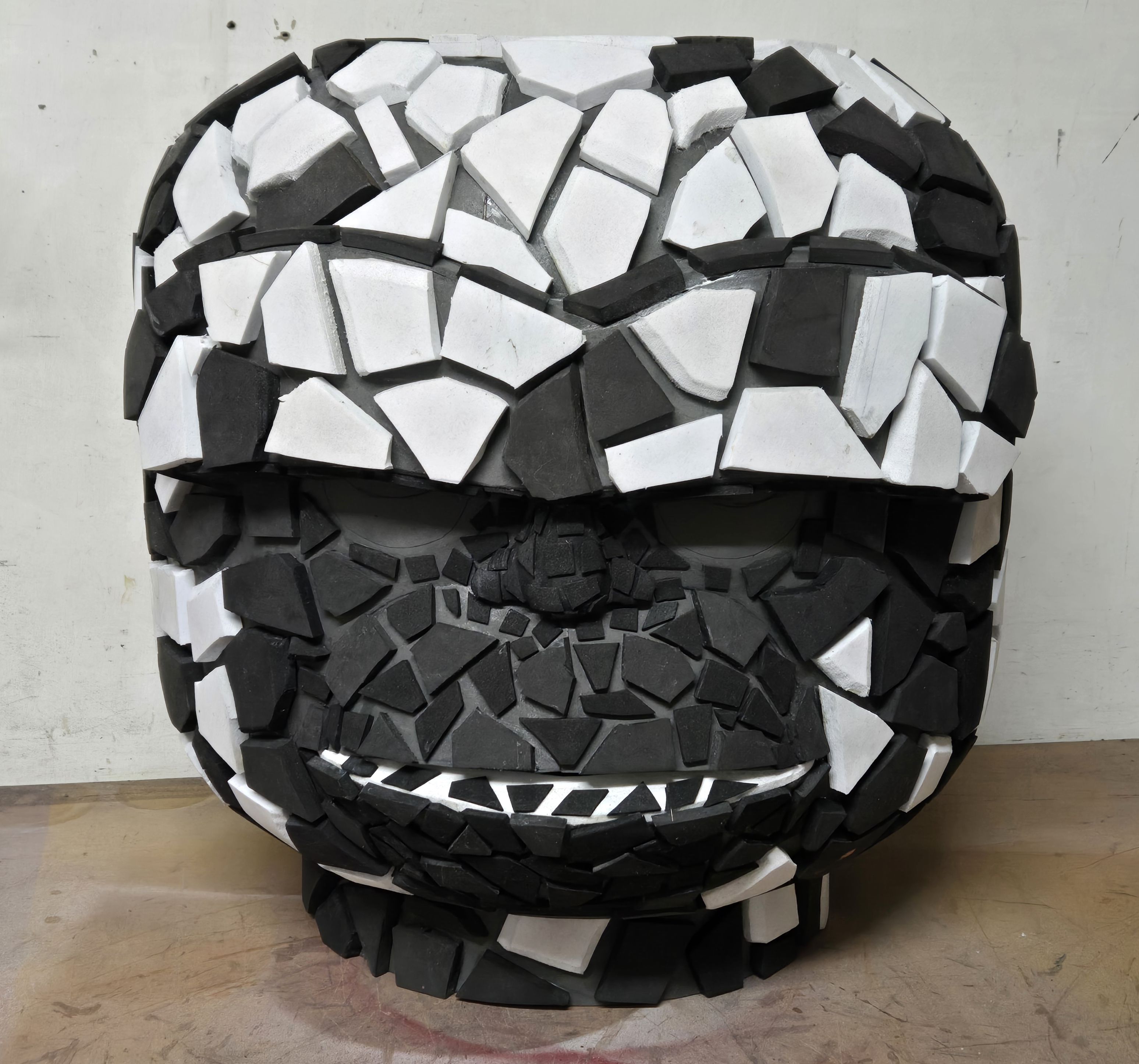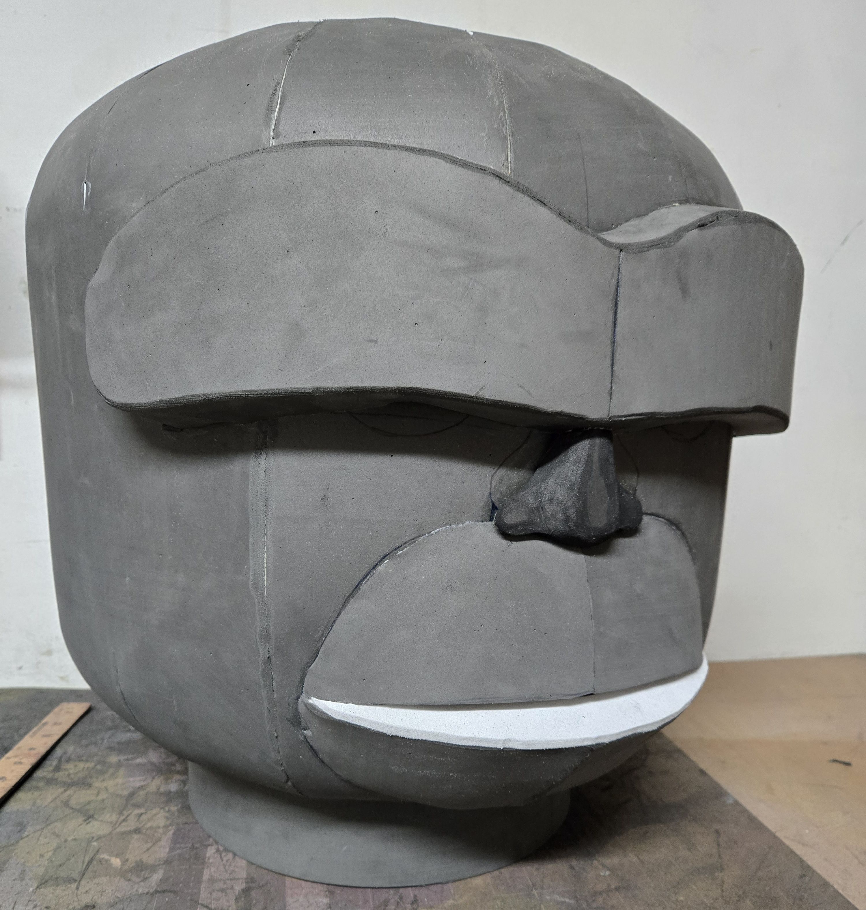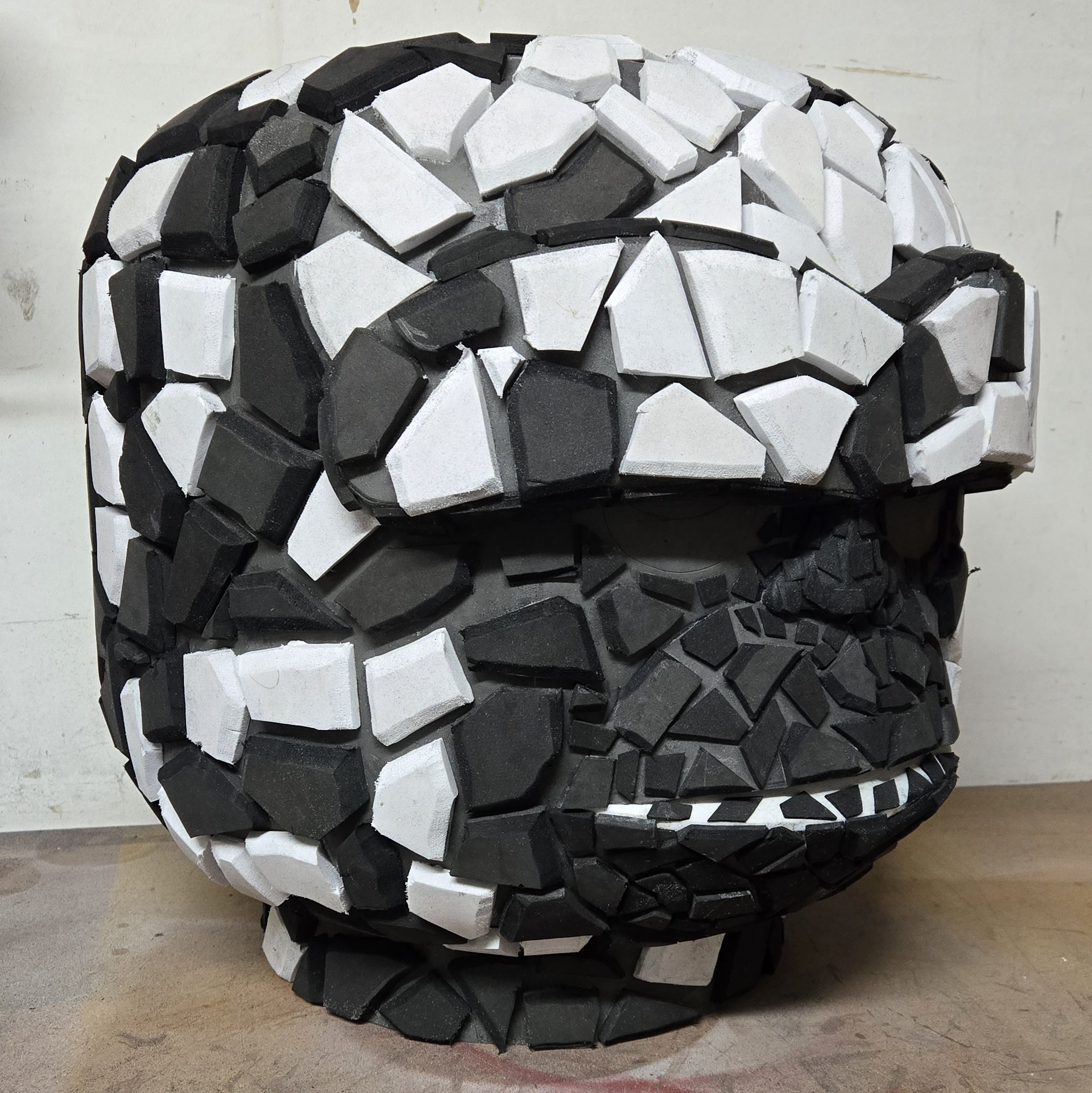 The basic head shape was completed in just a few hours but the rocky texture took several days of gluing individual scrap pieces of foam to the head and hands. The logo on the chest was 3D printed.